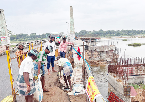 செய்யாற்றில் இரு கரைகளையும் தொட்டபடி ஏற்பட்ட வெள்ளப்பெருக்கு காரணமாக மேம்பாலத்தின் இணைப்பு பகுதி திடீரென உள்வாங்கிக் கொண்டதால், வாகன ஓட்டிகள்-பொதுமக்கள் அச்சமடைந்தனர். தகவல் அறிந்த நெடுஞ்சாலைத் துறையினர் சீரமைக்கும் பணியில் தீவிரமாக ஈடுபட்டுவருகின்றனர்.