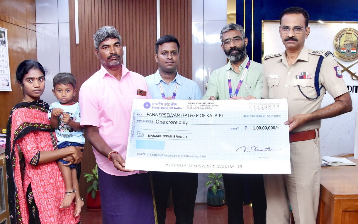இந்நிலையில் உயிரிழந்த கஜாவின் தந்தை பன்னீர்செல்வம், கஜாவின் மனைவி பிரவீனா (வயது 28), மகன் அதியன் (2) ஆகியோரிடம் ரூ. 1 கோடிக்கான காசோலையை கடலூர் மாவட்ட காவல் கண்காணிப்பாளர் எஸ்.ஜெயக்குமார் வழங்கினார்.