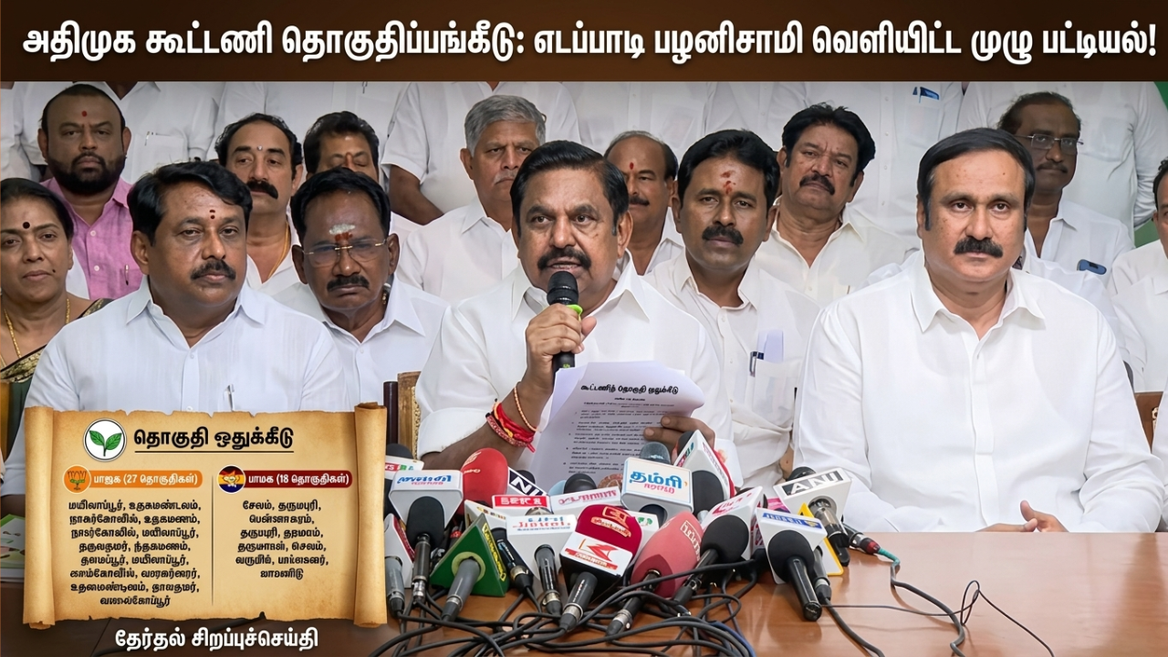 தமிழகத்தில் தேர்தல் களம் சூடுபிடித்துள்ள நிலையில், அதிமுக தலைமையிலான கூட்டணியில் இடம்பெற்றுள்ள கட்சிகளுக்கு ஒதுக்கப்பட்ட தொகுதிகளின் அதிகாரப்பூர்வ பட்டியல் இன்று வெளியிடப்பட்டது.