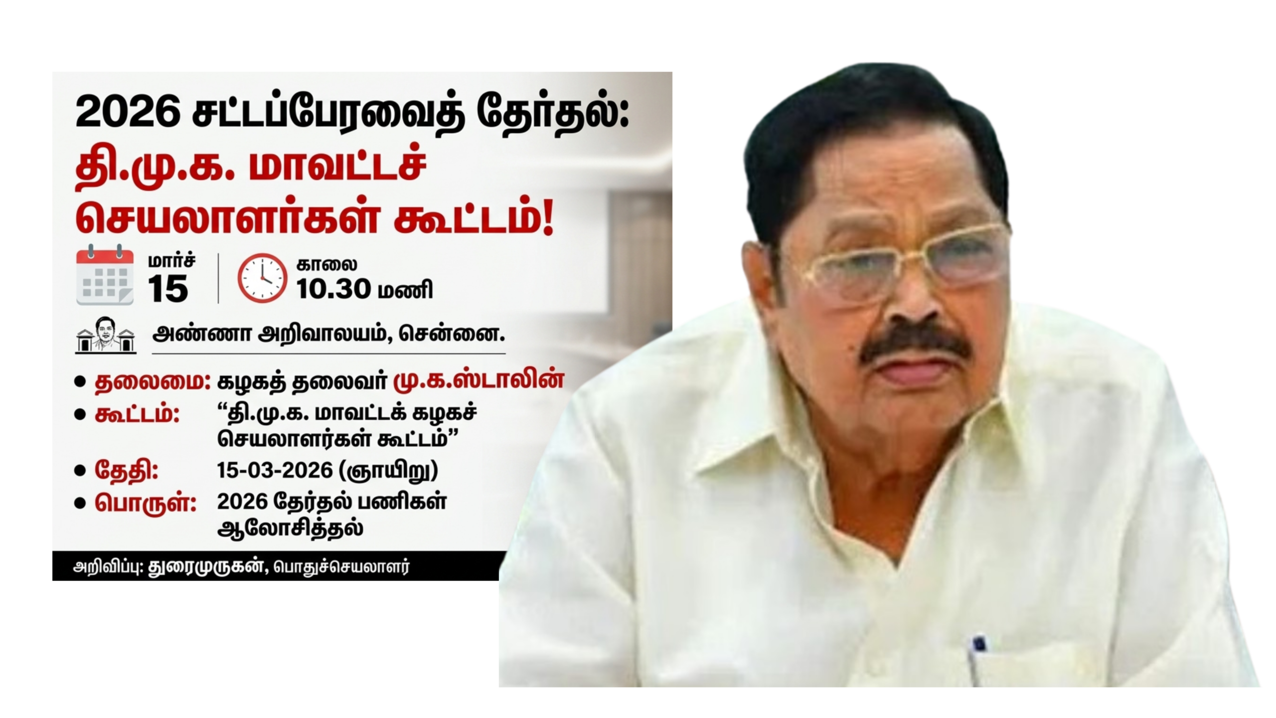 2026 சட்டமன்றத் தேர்தல்: மார்ச் 15-ல் திமுக மாவட்டச் செயலாளர்கள் கூட்டம் – துரைமுருகன் அறிவிப்பு