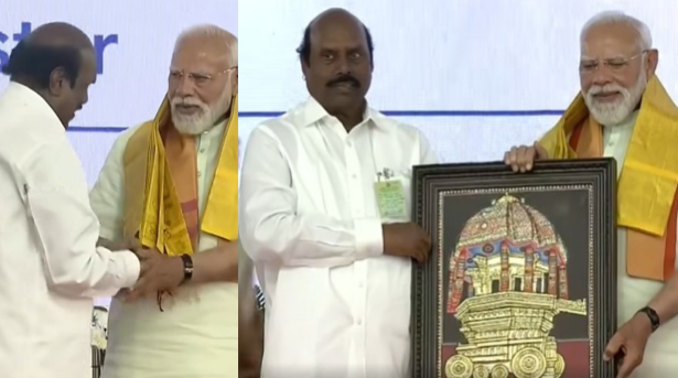 மதுரையில் நடைபெற்ற மத்திய அரசு விழாவில் பங்கேற்ற பிரதமர் நரேந்திர மோடிக்கு, தமிழக அரசு சார்பில் பொதுப்பணித்துறை மற்றும் நெடுஞ்சாலைத்துறை அமைச்சர் எ.வ.வேலு நினைவுப்பரிசு வழங்கி கௌரவித்தார்.