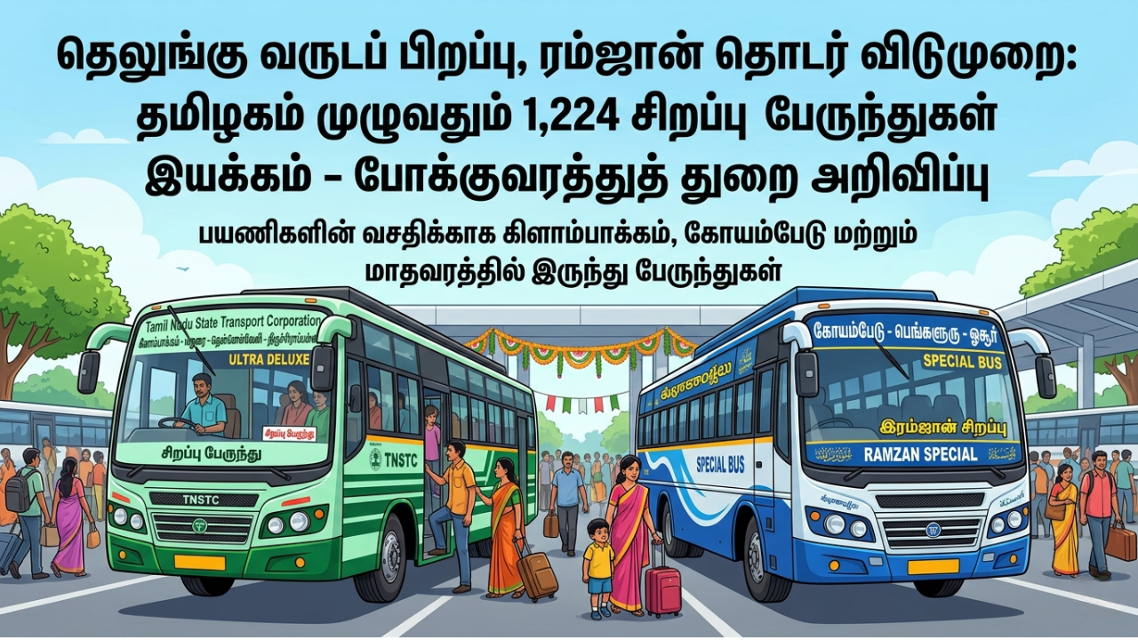 • தொடர் விடுமுறை: தமிழகம் முழுவதும் 1,224 சிறப்பு பேருந்துகள் இயக்கம் – போக்குவரத்துத் துறை அறிவிப்பு