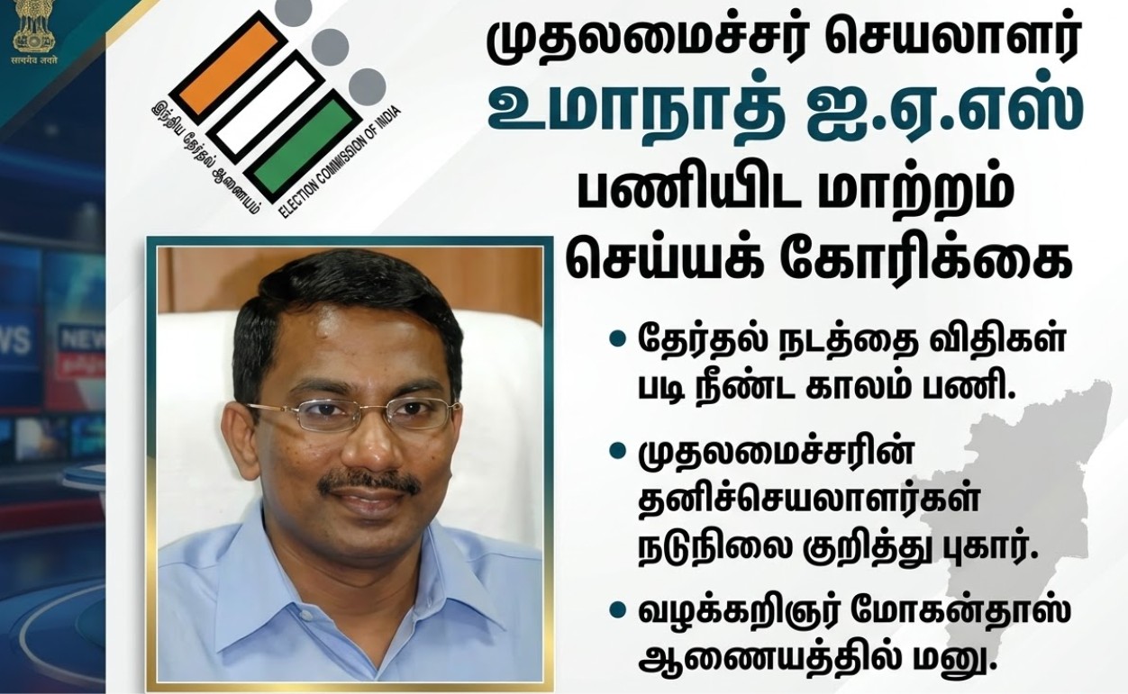 தமிழக முதலமைச்சரின் செயலாளராகப் பணியாற்றி வரும் உமாநாத் ஐ.ஏ.எஸ் (Umanath IAS) அவர்களை உடனடியாகப் பணியிட மாற்றம் செய்யக் கோரி இந்திய தேர்தல் ஆணையத்தில் மனு அளிக்கப்பட்டுள்ளது.