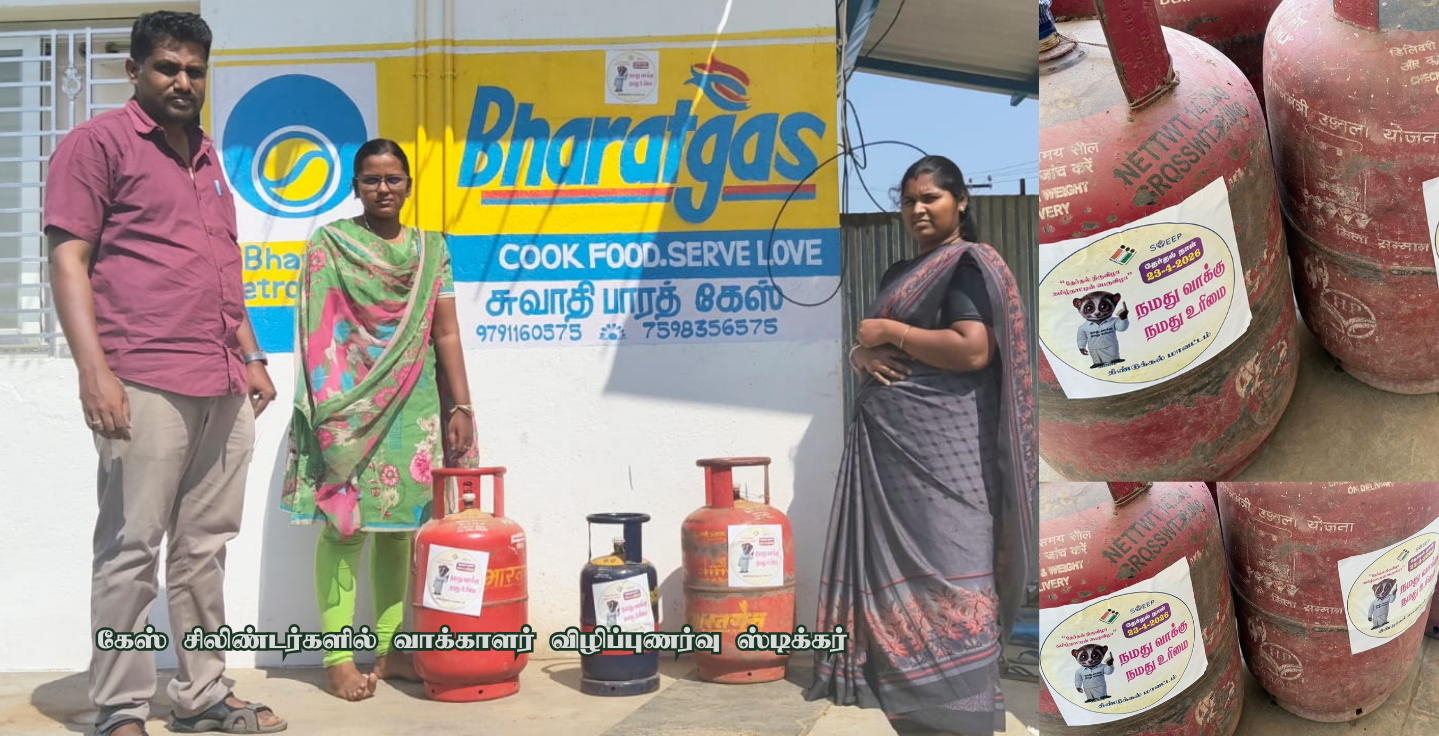 தனியார் கேஸ் ஏஜென்சிகளுக்குச் சென்றும், விநியோகத்திற்காகச் செல்லும் சரக்கு வாகனங்களை நிறுத்தியும், வீடுகளில் பயன்படுத்தப்படும் கேஸ் சிலிண்டர்களில் “நமது வாக்கு நமது உரிமை” மற்றும் தேர்தல் தேதி குறிப்பிடப்பட்ட ஸ்டிக்கர்களை ஒட்டி வருகின்றனர்.